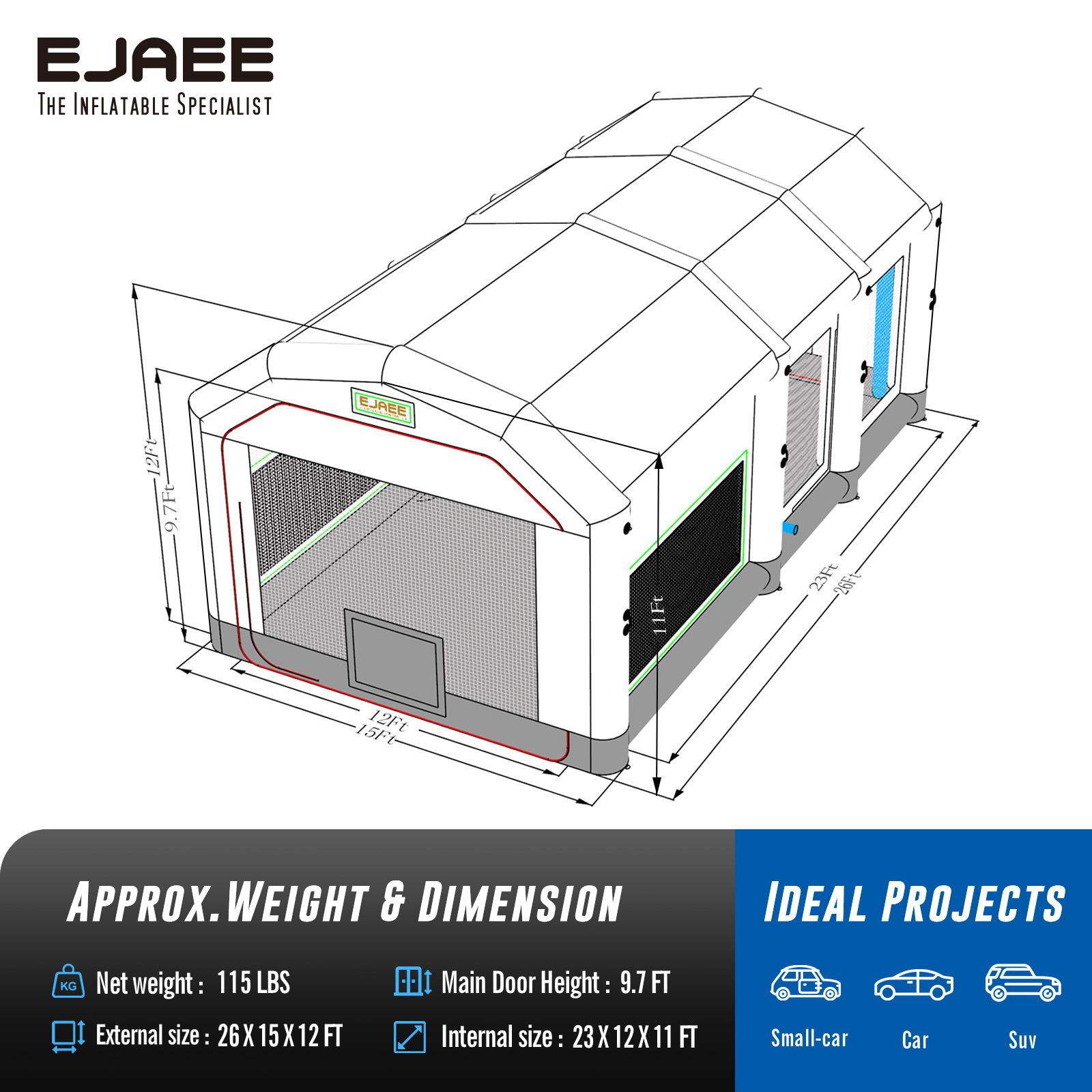 EJAEE Gold Series 26x15x12Ft Inflatable Spray Paint Booth – Standard Bundle
