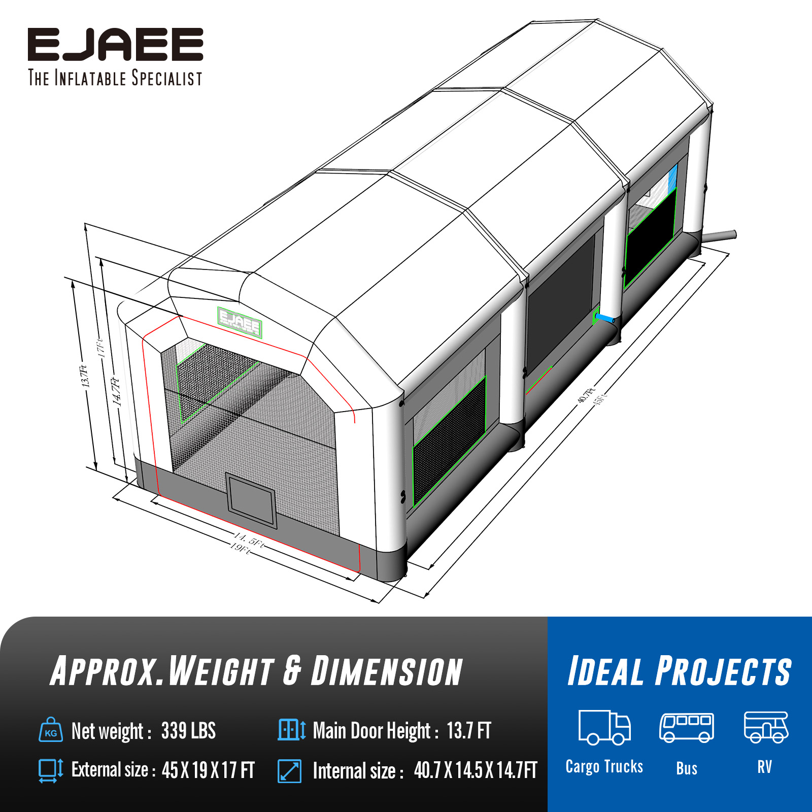 EJAEE Platinum Series 45x19x17Ft Inflatable Spray Paint Booth – Standard Bundle