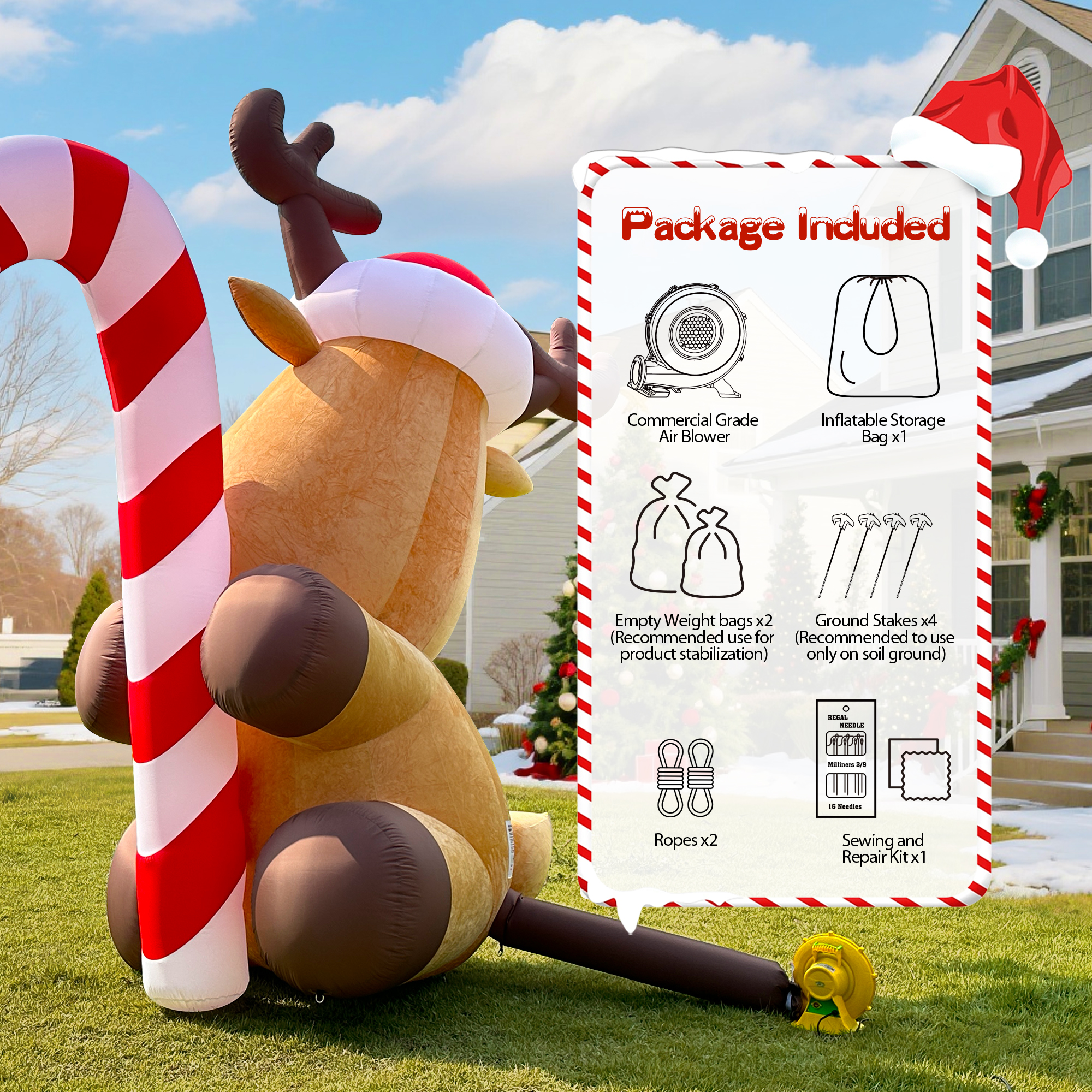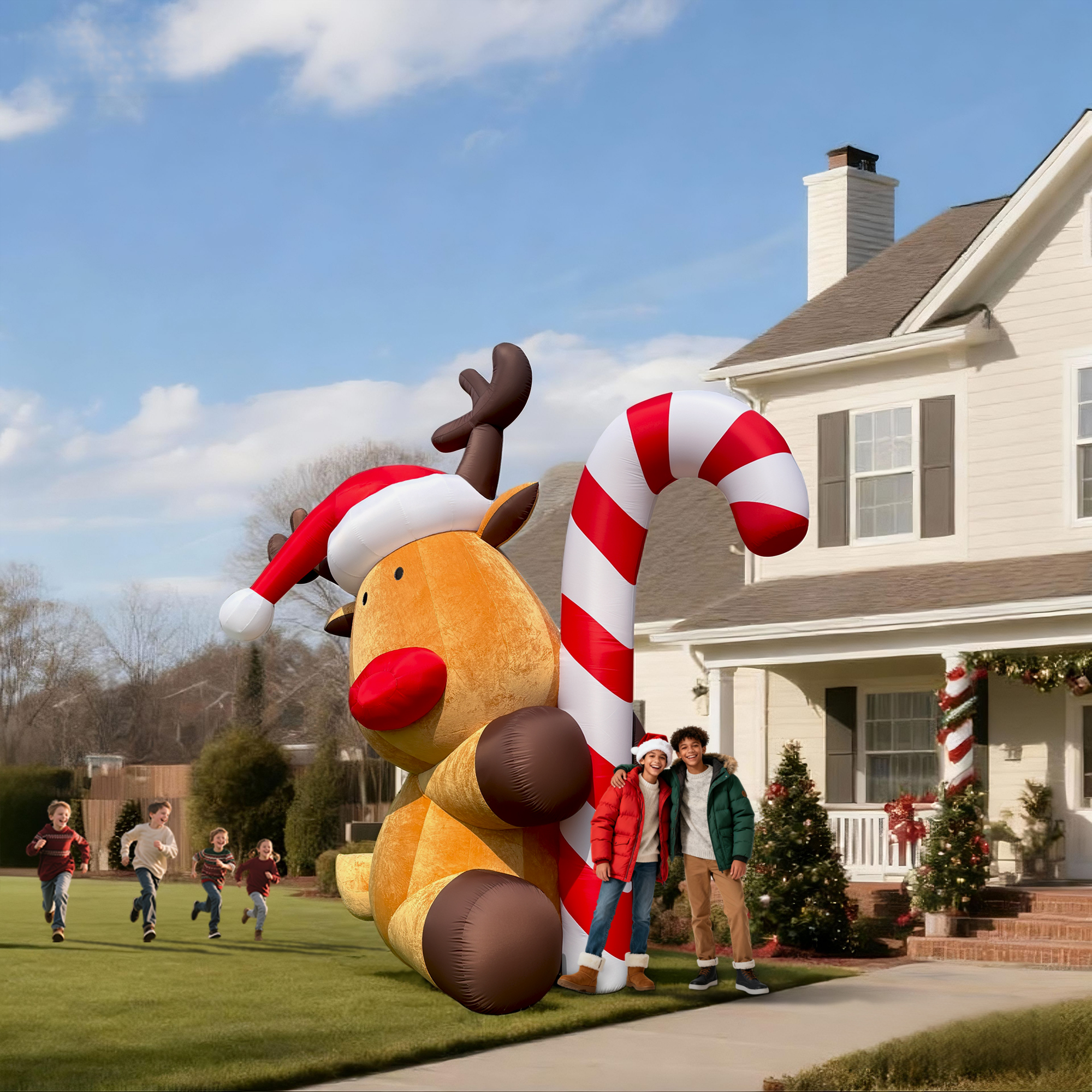 Add cozy holiday charm with this Giant Inflatable Reindeer, crafted from soft flocked cloth for a velvety look and finished with a reinforced PVC bottom for durability. Styled with a Santa hat, bright red nose, and oversized candy cane, this adorable reindeer is the perfect blend of festive fun and quality design.