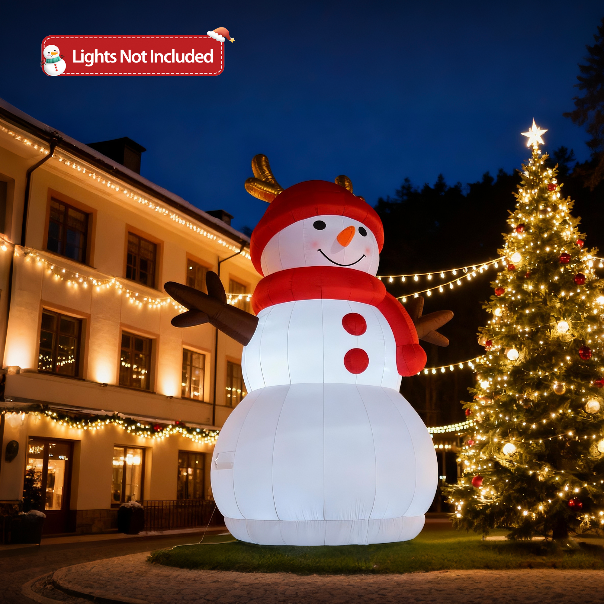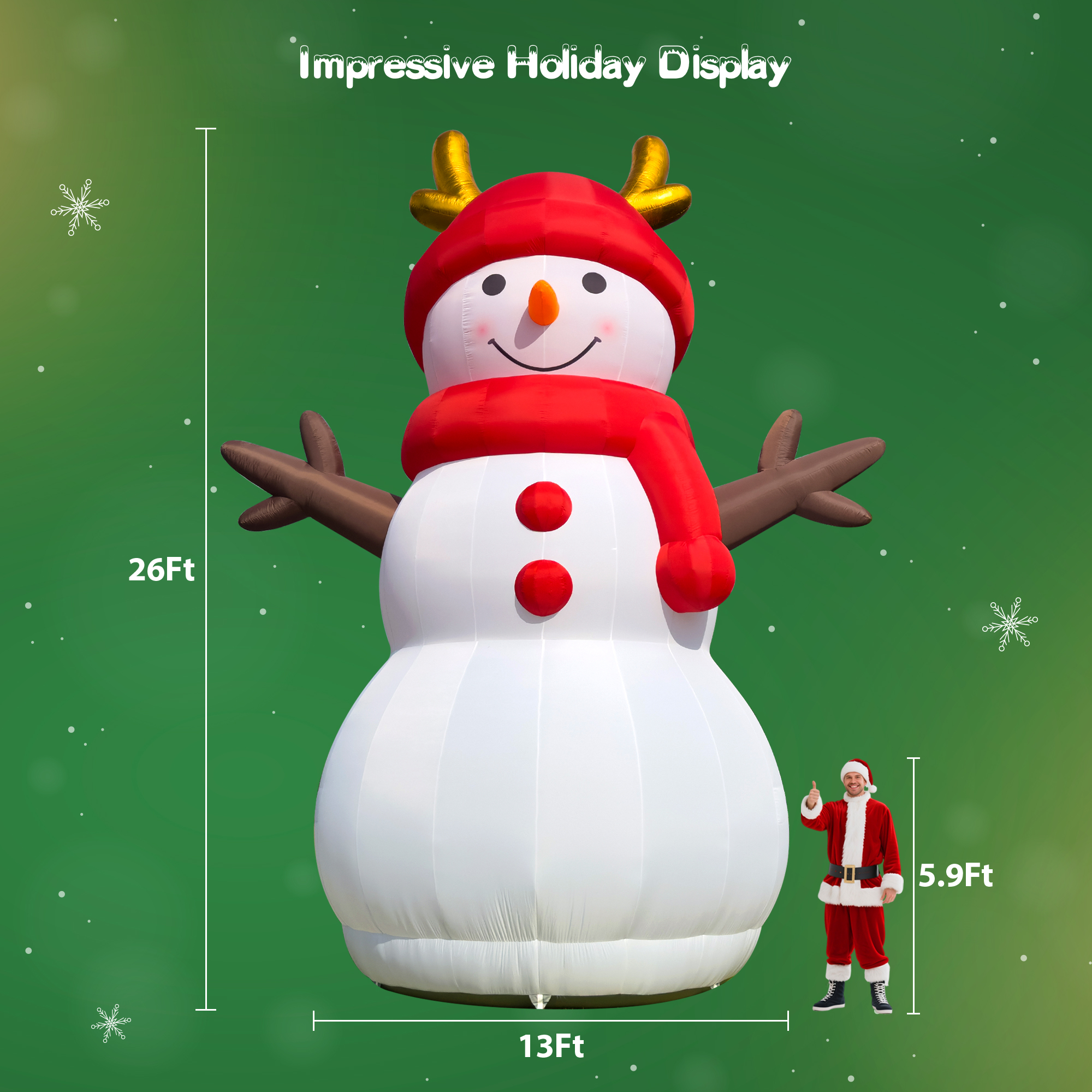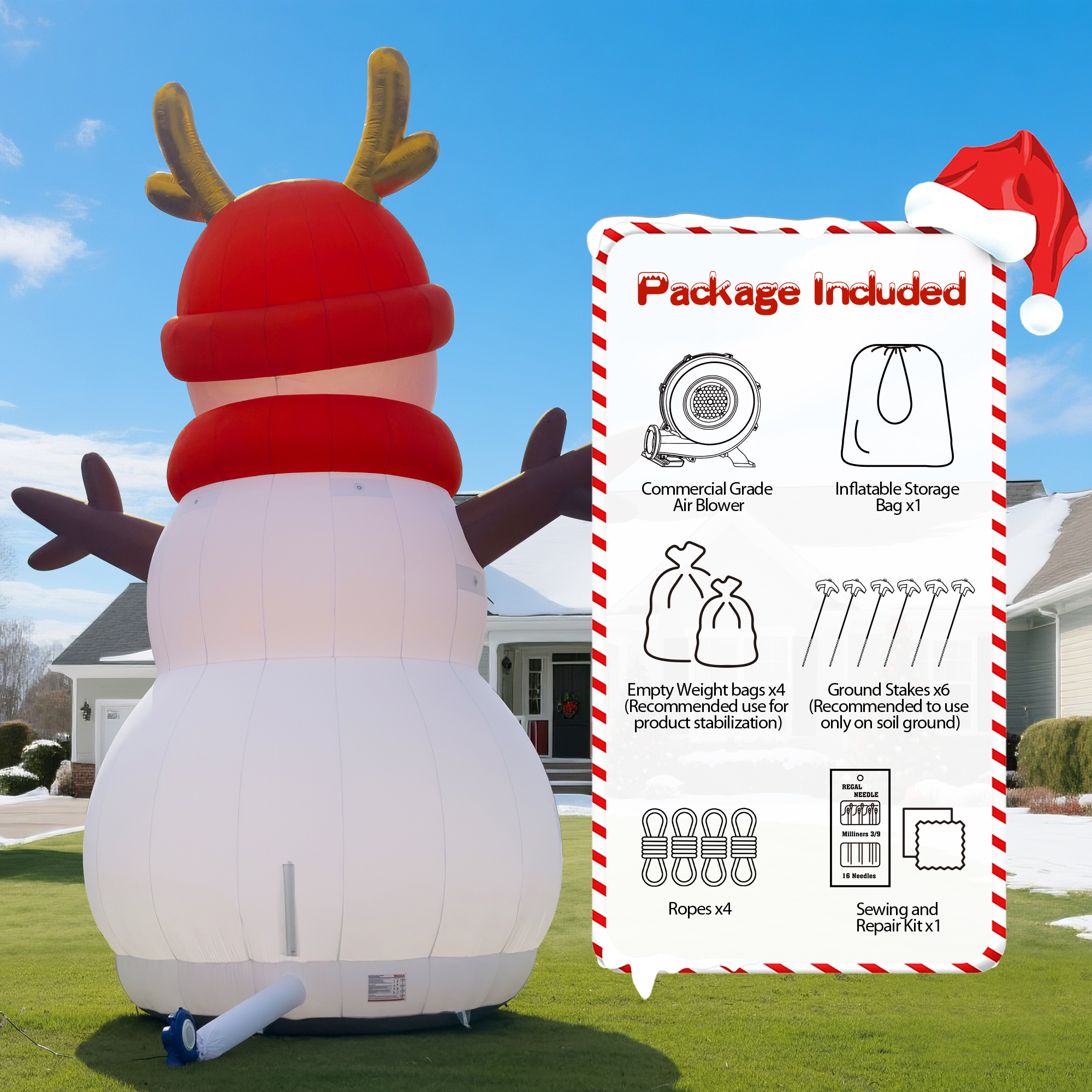 Make your holidays unforgettable with this 26FT Giant Snowman Inflatable! Featuring a cheerful smile, bright red scarf, festive hat, and golden antlers, this giant snowman is the perfect way to bring Christmas magic to your front yard or event.