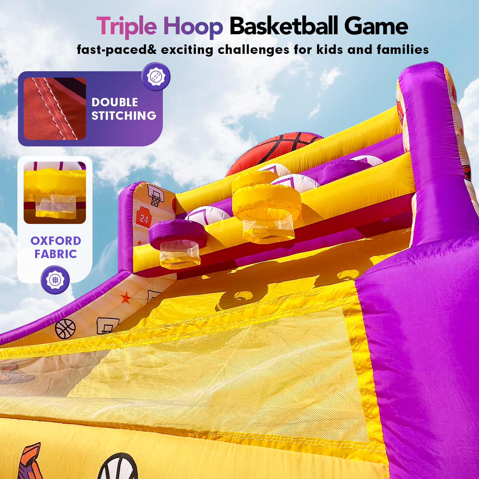 • Triple Hoop Design for multi-level basketball game and non-stop excitement for kids and families