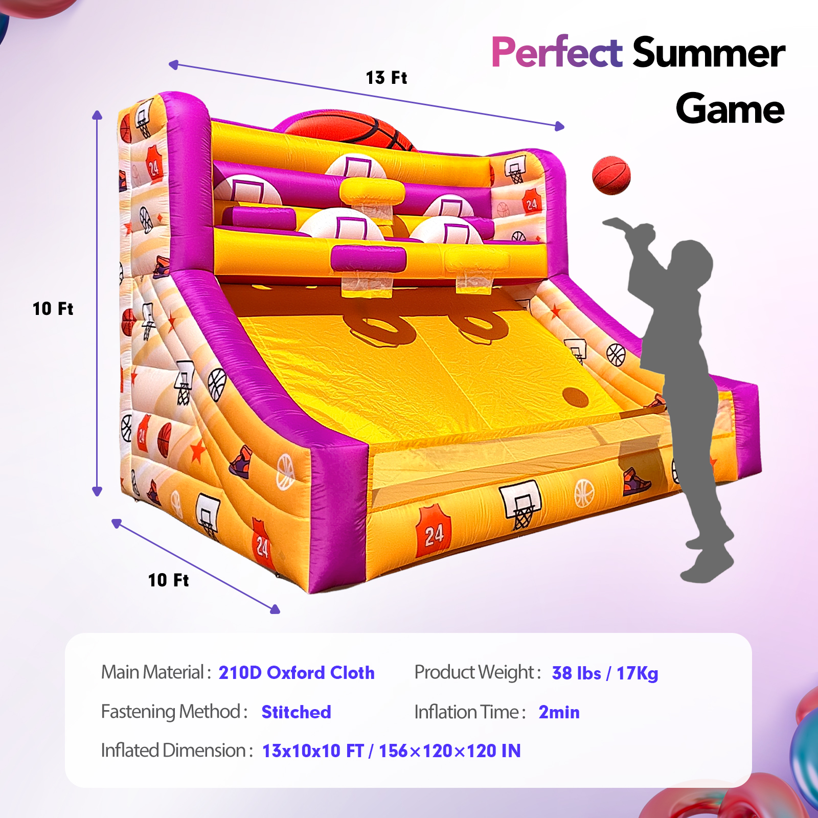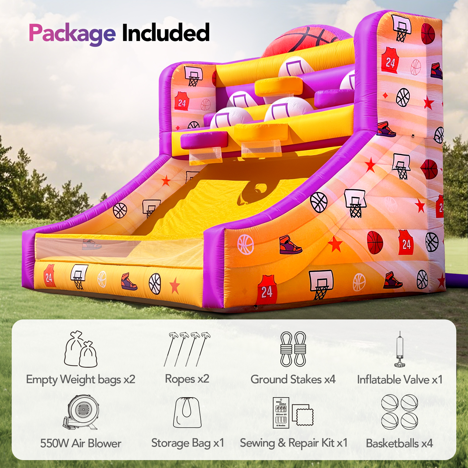 • Comes with 500W blower and basketballs for fast, easy setup